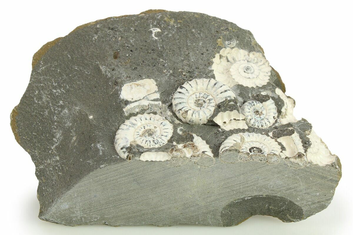 The site that produces this material is no longer accessible. Because of this, these specimens are becoming increasingly harder to obtain. The piece has been painstakingly prepared with mechanical tools to expose all of the individual ammonite fossils.