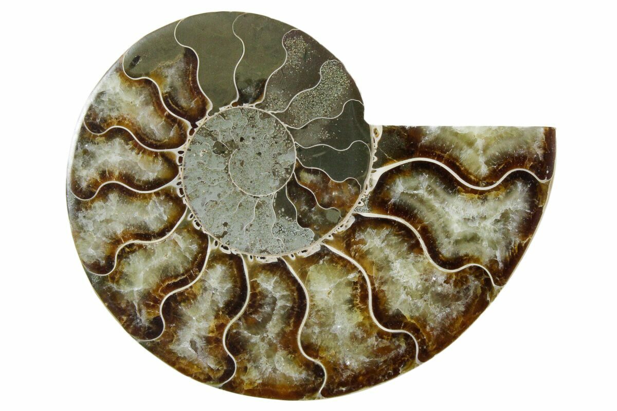 Here is a beautiful, 3.3" wide, cut and polished Cleoniceras ammonite fossil from Madagascar. These ammonites are Cretaceous in age, approximately 110 million years old. This specimen exhibits gorgeous mineralization within the chambers, each separated by white calcite septa (divisions). This highly polished, exotic ammonite makes a superb display piece with tremendous historical appeal.