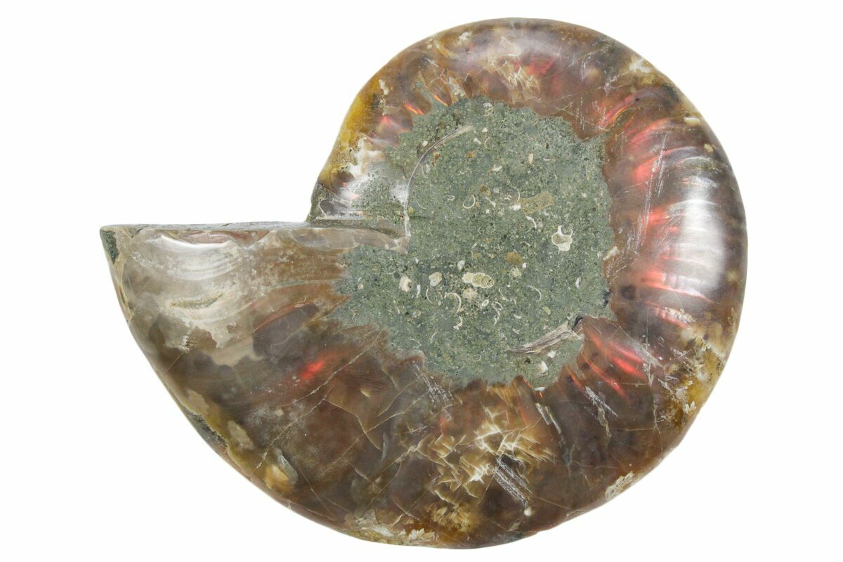 Here is a beautiful, 3.3" wide, cut and polished Cleoniceras ammonite fossil from Madagascar. These ammonites are Cretaceous in age, approximately 110 million years old. This specimen exhibits gorgeous mineralization within the chambers, each separated by white calcite septa (divisions). This highly polished, exotic ammonite makes a superb display piece with tremendous historical appeal.