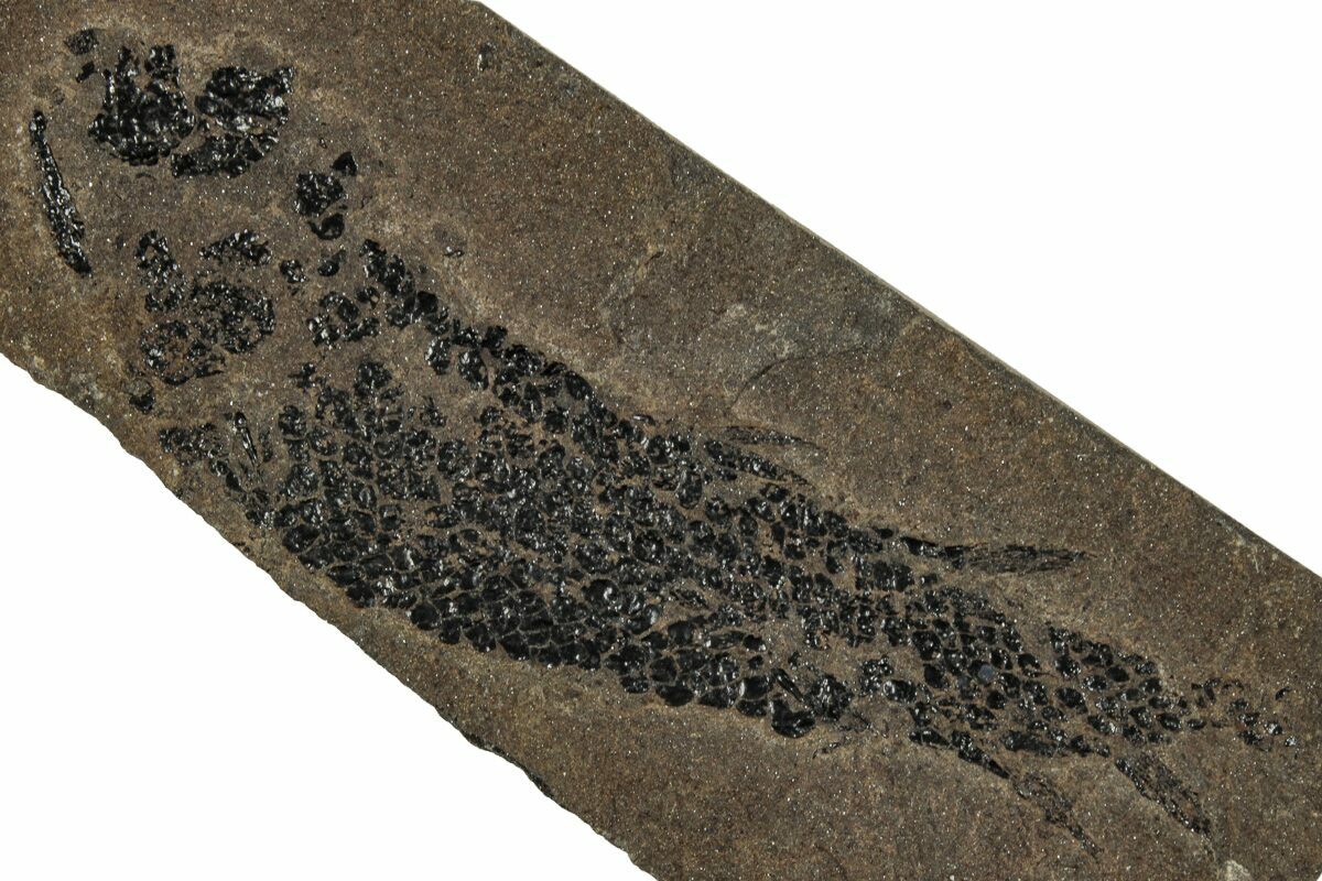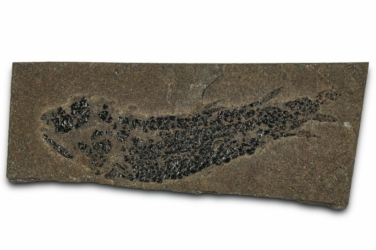 This is a 3.3" long specimen of the Devonian "Lobed-Fin" fish, Osteolepis panderi. It was collected from the Middle Devonian-aged Old Red Sandstone in Caithness, Scotland. It comes with an acrylic display stand.