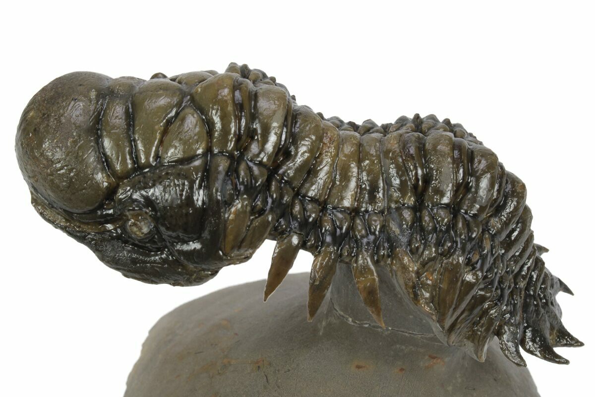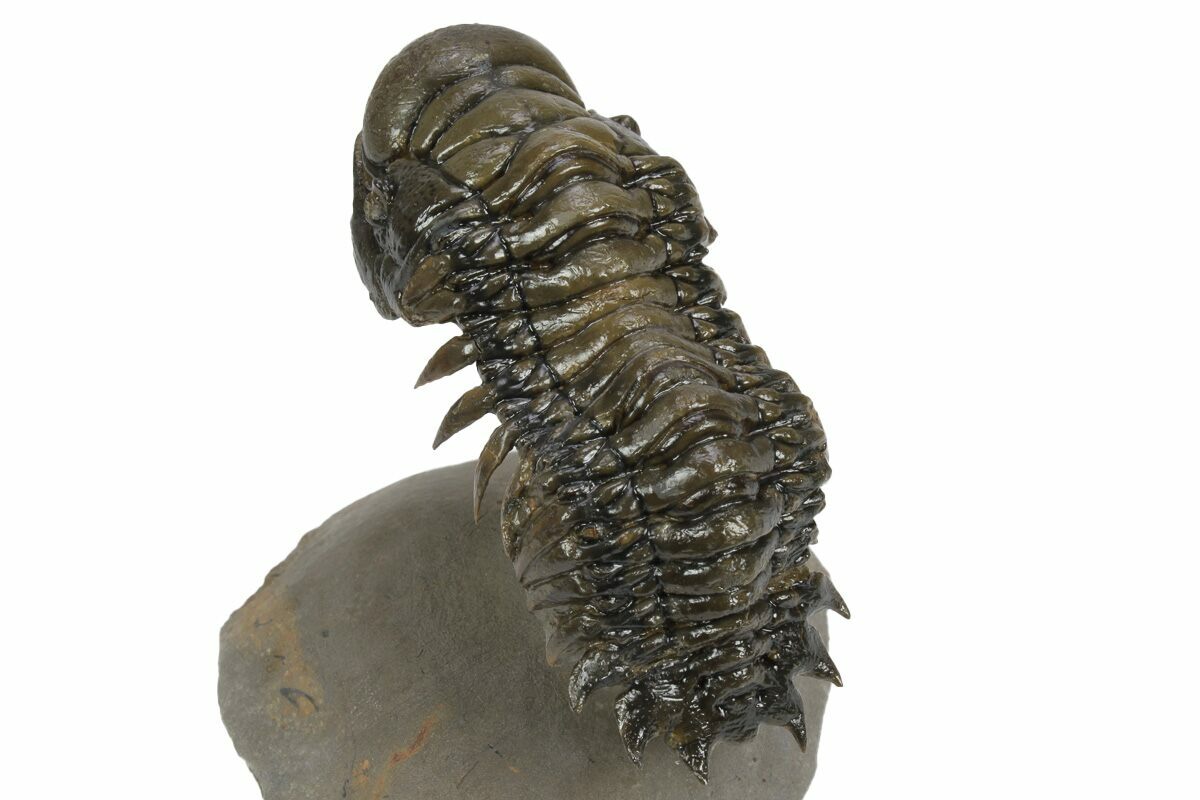 This is an impressive, 3.3" long (if outstretched) specimen of Crotalocephalina gibbus from Atchana, Morocco. Nice preparation and shell detail. It has been prepared in a "flying" pose by removing nearly all of the surrounding limestone. This leaves it floating above the rock on a pedestal. The preparation takes lot of time but the results are quite spectacular.