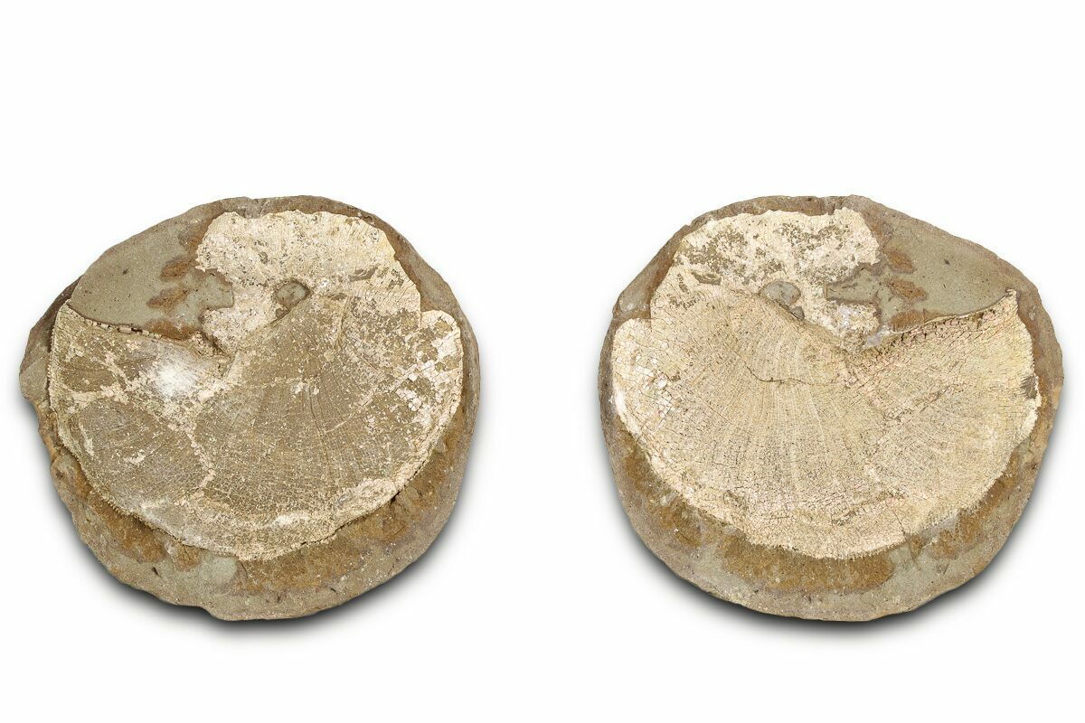 This new find out of the Fox Hills Formation in South Dakota is a fascinating, 3.3" wide Hoploscaphities nicoletti ammonite fossil, collected on private land along the Moreau River in Ziebach County. It's still in the split nodule it was found in, both halves of which are included. The champagne-pink and purple iridescence is remnant mother of pearl from the original shell. Often it's slightly altered to include some iron, manganese, etc., from the surrounding matrix.