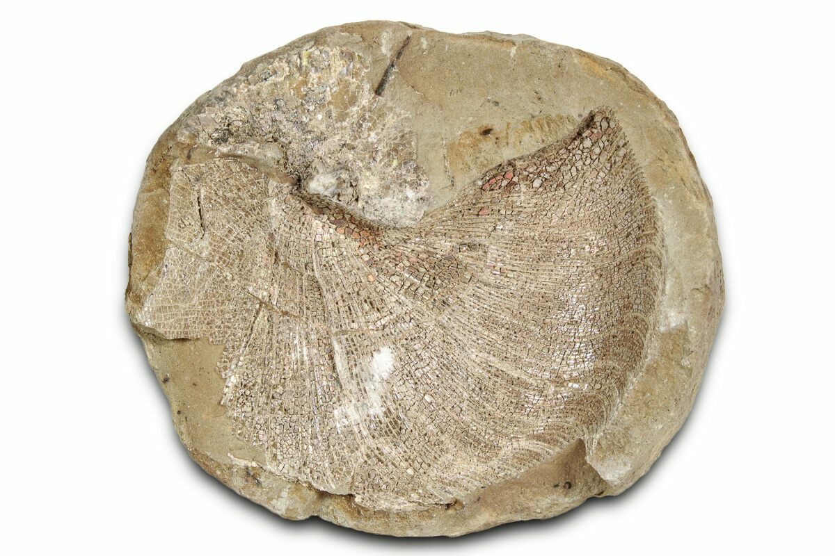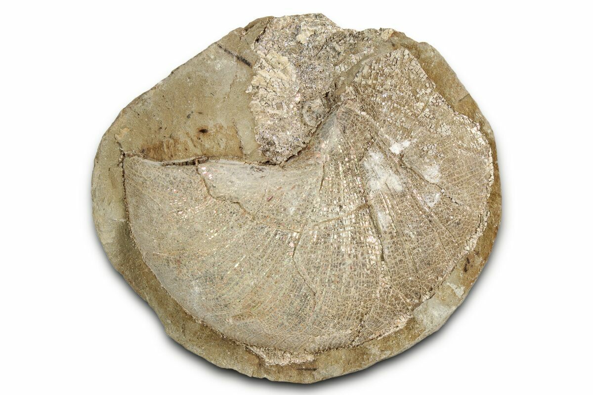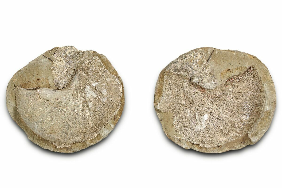 This new find out of the Fox Hills Formation in South Dakota is a fascinating, 3.3" wide Hoploscaphities nicoletti ammonite fossil, collected on private land along the Moreau River in Ziebach County. It's still in the split nodule it was found in, both halves of which are included. The champagne-pink and purple iridescence is remnant mother of pearl from the original shell. Often it's slightly altered to include some iron, manganese, etc., from the surrounding matrix.