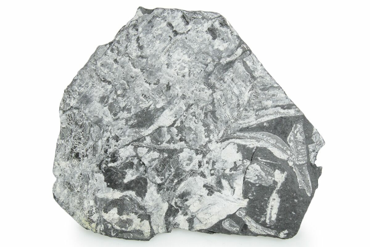 These plants were buried in a swamp where a low temperature, low pressure, and low oxygen environment caused the plant tissue to be slowly replaced by pyrite. This pyrite was later replaced by a whitish mineral (aluminum silicate) as the fossils were buried and exposed to the heat and pressure inside of the earth. The majority of the ferns on this plate are of the genus Alethopteris, though Pecopteris ferns can be seen from time to time.