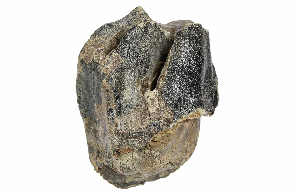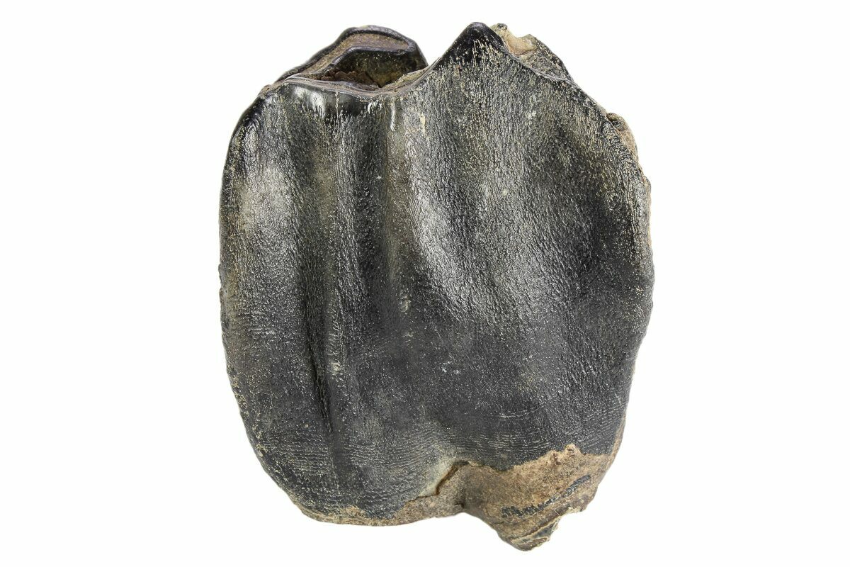 This is a well preserved fossil tooth crown from the upper jaw of a woolly rhinoceros (Coelodonta antiquitatis). The enamel is very well preserved, with black-grey tones coating most of the crown. This fossil comes from Siberia, Russia, where many Woolly Mammoth and Rhino fossils are unearthed. The tooth measures 3.3" tall.