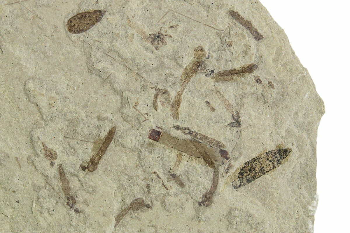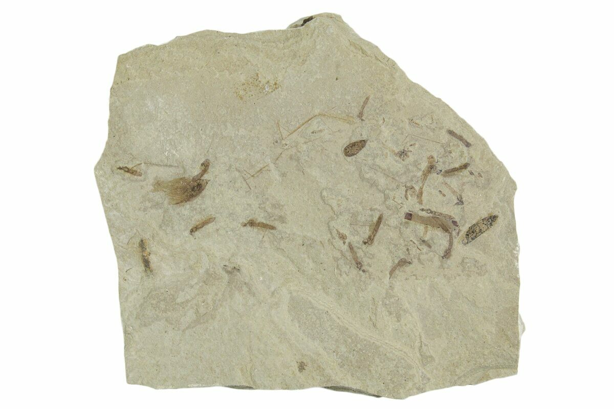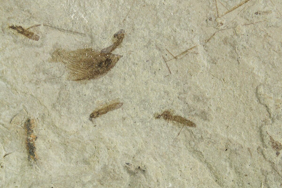 This is a 3.3" wide mortality plate featuring several dozen detailed crane flies (family Tipulidae) and a well-preserved beetle (order Coleoptera), collected from the Green River Formation of Utah. While the Green River Formation is best know for its fish fossils, other areas produce incredible plant fossils and insect fauna.