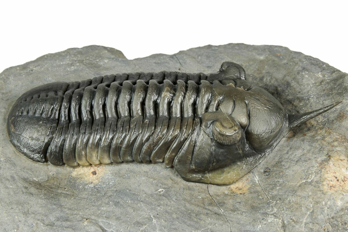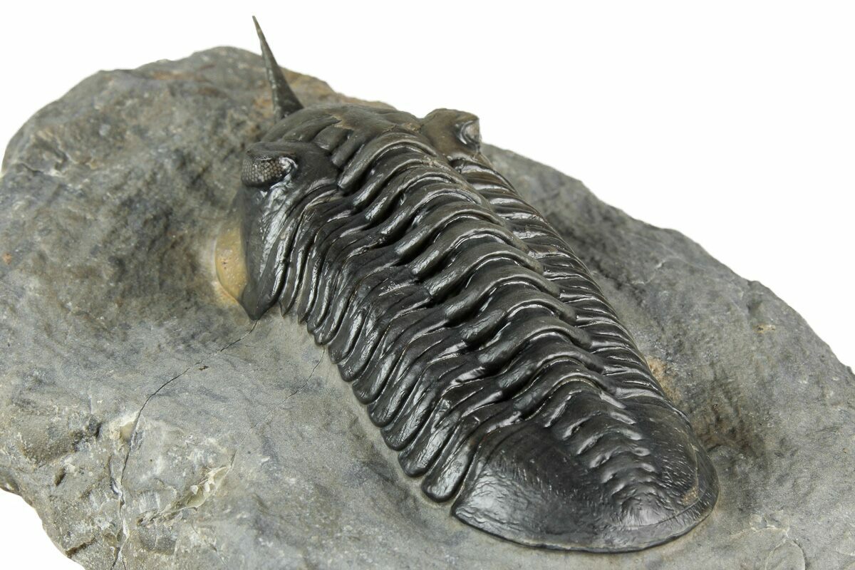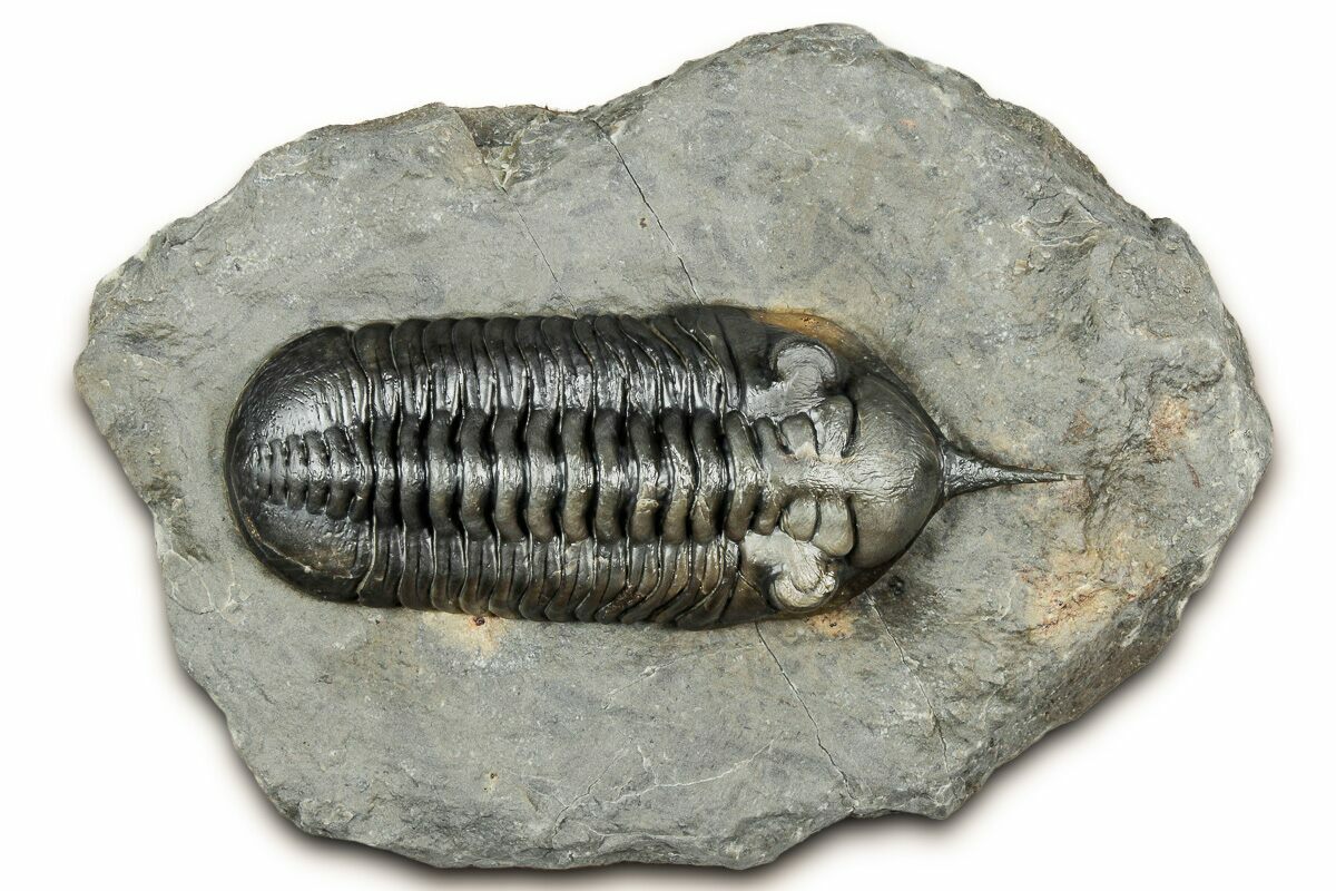 Here is a 3.3" long, phacopid trilobite (Morocconites malladoides) quarried from the deposits near Ofaten, Morocco. This member of the Phacopida trilobites has a very defining feature, a long pointed rostrum (snout) coming off of its head. It's unclear what purpose this rostrum would have served, but it could have potentially been used to help it dig through the mud.
