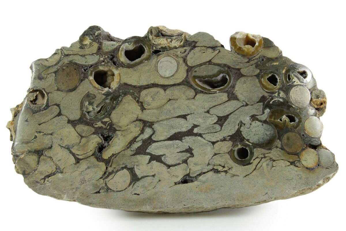 This is a polished slab of fossil Teredo Wood from the Isle of Sheppey in England. Teredo petrified wood is unique because of the "worming" of the original wood by the prehistoric Teredo (Teredolites longissimus)--a worm-shaped marine mollusk related to modern clams, mussels, and oysters. This petrified wood comes out of the London Clay Formation and is Eocene in age. The teredo burrows have been lined with calcite, giving the petrified wood a very interesting look.