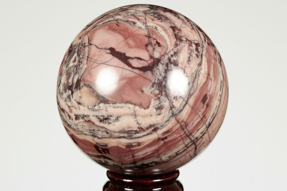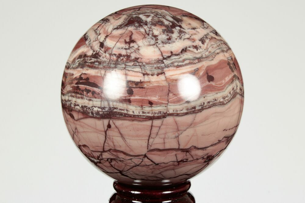 This is a gorgeous, 3.3" wide jasper sphere of Kona dolomite that was collected from the Kona Hills of Michigan. The sphere has a mixture of creamy dolomite hues and deep-red and maroon coloration.