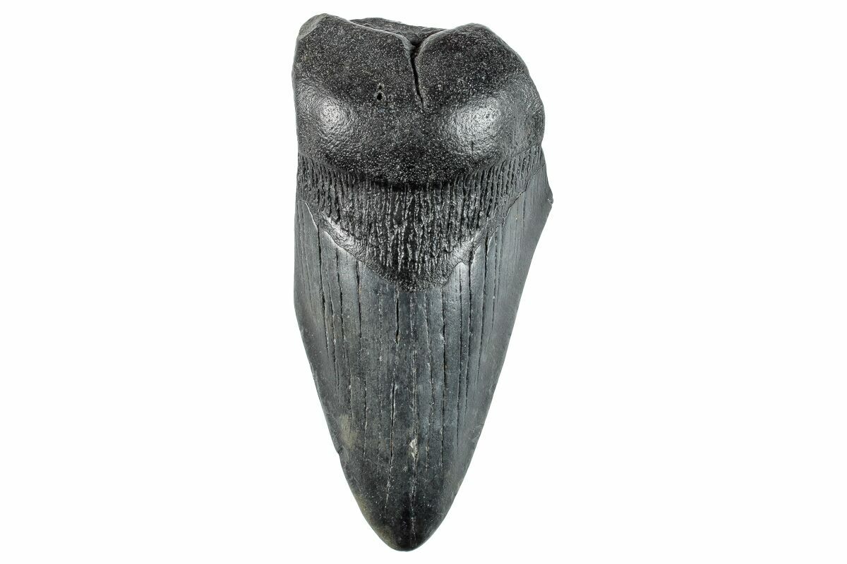 The standard measure for megalodon teeth is slant height, or the longest edge of the tooth. Adult megalodon teeth were typically in the 4 to 5 inch range: teeth over 6 inches are rare and represent super-sized individuals. Only a handful of teeth have ever been found over seven inches.