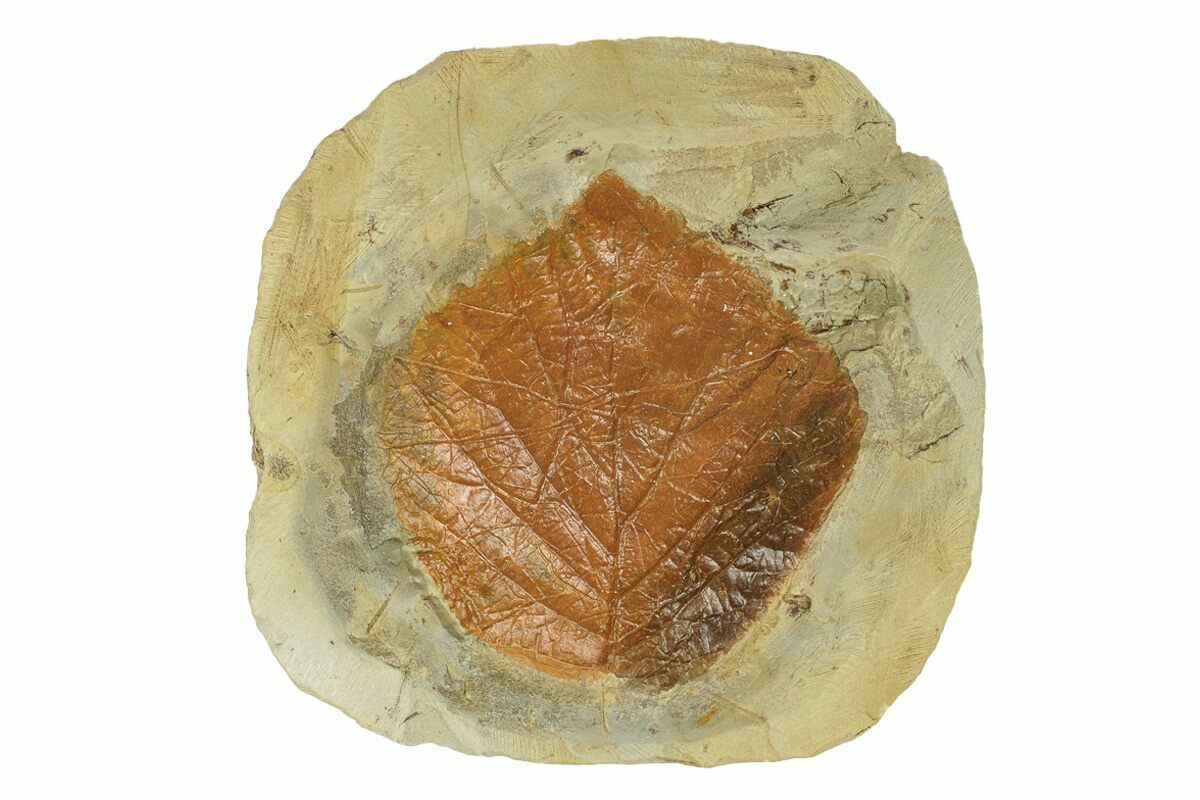 This is a fossil leaf (Davidia antiqua) from the Fort Union Formation near Glendive, Montana. The dark red-orange preservation contrasts well against the shale, and many of the details in the leaf can be seen in good relief. There may be some touchups to the surface of the leaf where some of it flaked onto the negative during collection.