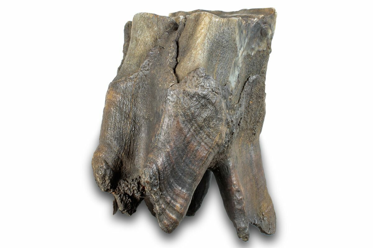 This is a beautifully preserved fossil tooth from the upper jaw of a woolly rhinoceros (Coelodonta antiquitatis). The enamel is very well preserved, with black-grey tones coating most of the crown. This fossil comes from Siberia, Russia, where many Woolly Mammoth and Rhino fossils are unearthed. The tooth is in excellent condition with an intact root. Including the root, the tooth measures 3.35" tall.