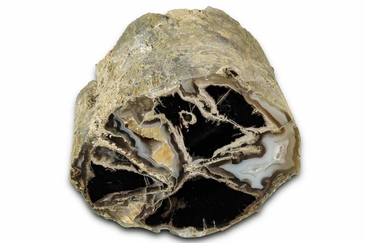 This petrified wood was formed when trees died and fell into a swamp where they were rapidly covered by algae. This formed casts that preserved the original bark surfaces and kept the trees from decaying. Eventually the algae casts and the spaces between them were filled in by minerals, often in exquisite crystalline form. These casts have preserved incredibly fine details in the wood, providing researchers with a wealth of information about these ancient trees. A paper on the formation of this petrified wood can be found at the link below.