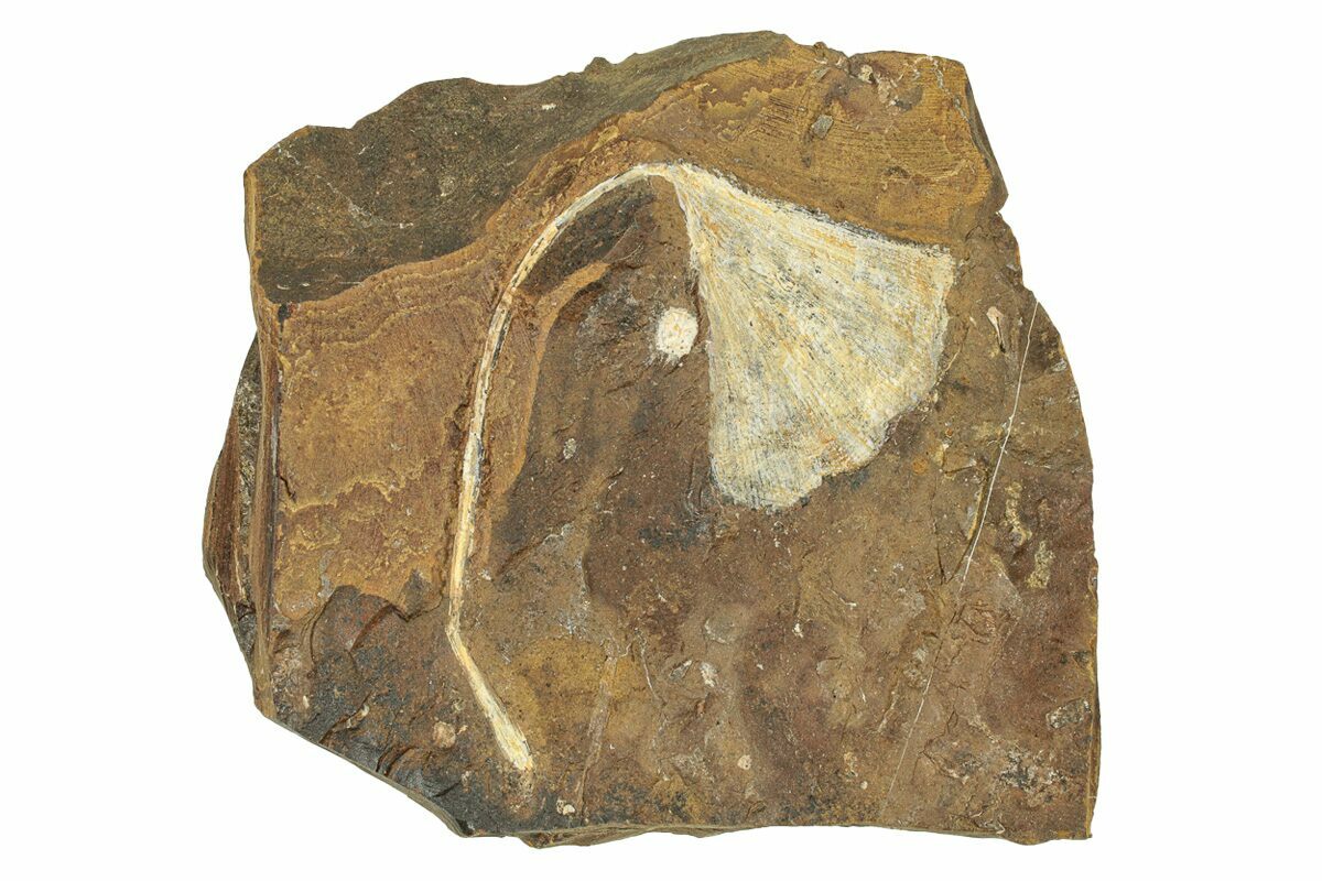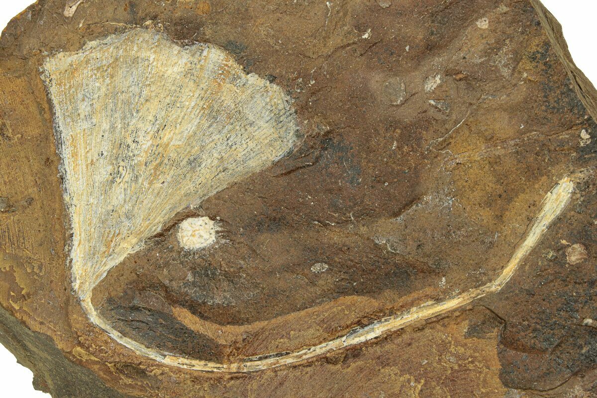 This is a beautifully preserved fossil ginkgo leaf (Ginkgo cranei) from the Sentinel Butte Formation of North Dakota. It is finely detailed and the light preservation contrasts well against the dark orangish-brown rock. A small seed pod can also be found on the plate.