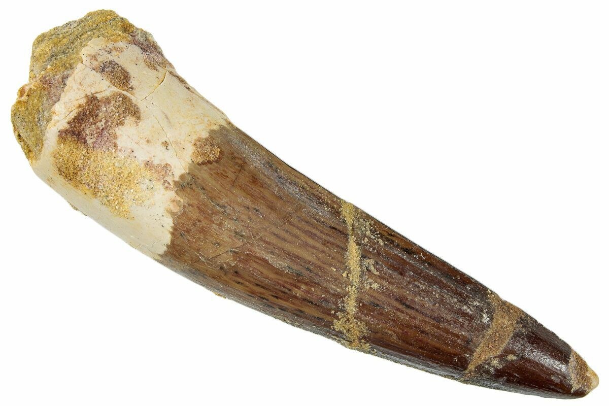 This is a 3.37" long Spinosaurus tooth from the Kem Kem Beds of Morocco. It is Late Cretaceous in age, approximately 95 million years old.