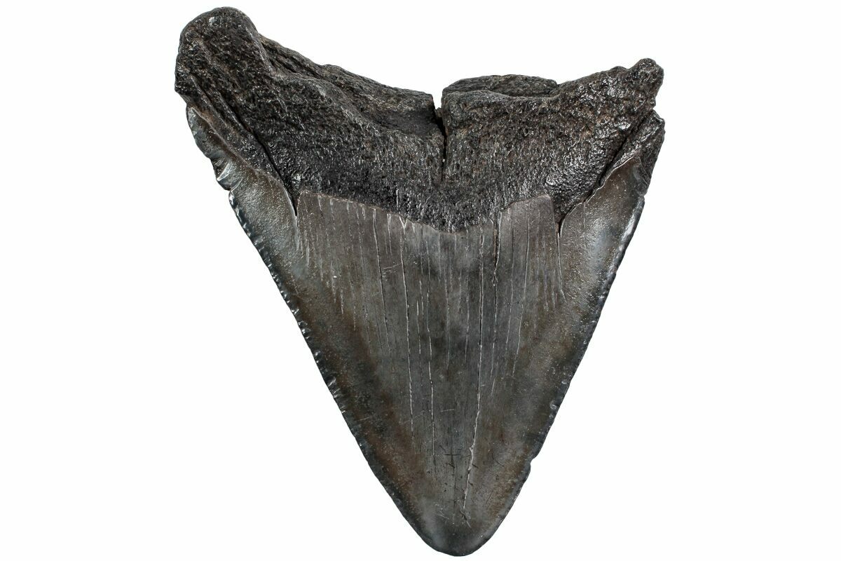 The standard measure for megalodon teeth is slant height, or the longest edge of the tooth. Adult megalodon teeth were typically in the 4 to 5 inch range: teeth over 6 inches are rare and represent super-sized individuals. Only a handful of teeth have ever been found over seven inches.