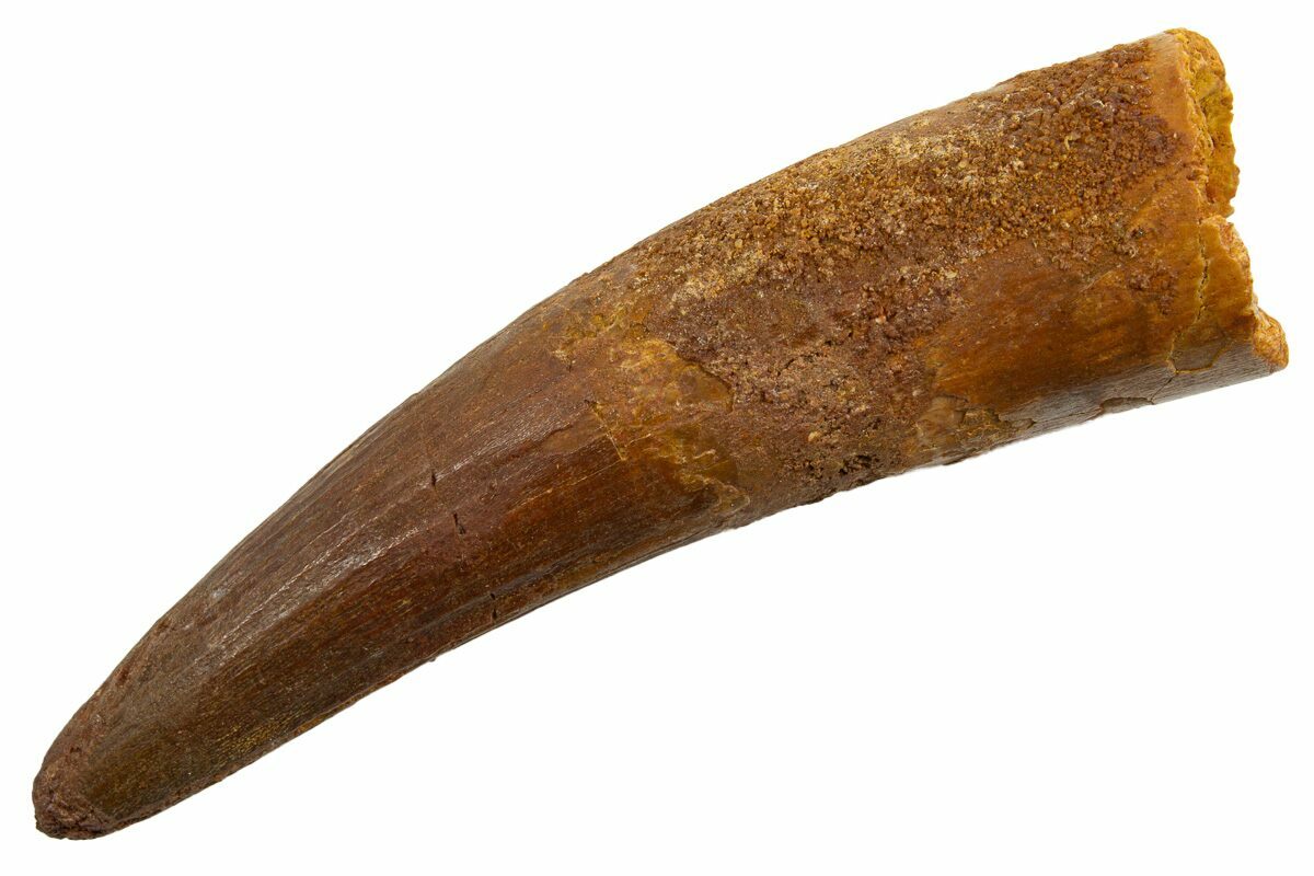 Spinosaurus teeth are relatively common fossils, but large (3+ inches), well-preserved examples are rare. These large Spinosaurus teeth will often be heavily doctored. We’ve seen many examples where multiple partial teeth can been glued to together to create a larger fake tooth, or where enamel has been painted on. One giveaway to look for is a ring of sand around the middle of the tooth, usually glued on to hide a break. Sometimes this is a sign that multiple partial teeth have been composited, but other times it is used to disguise a badly done repair job.