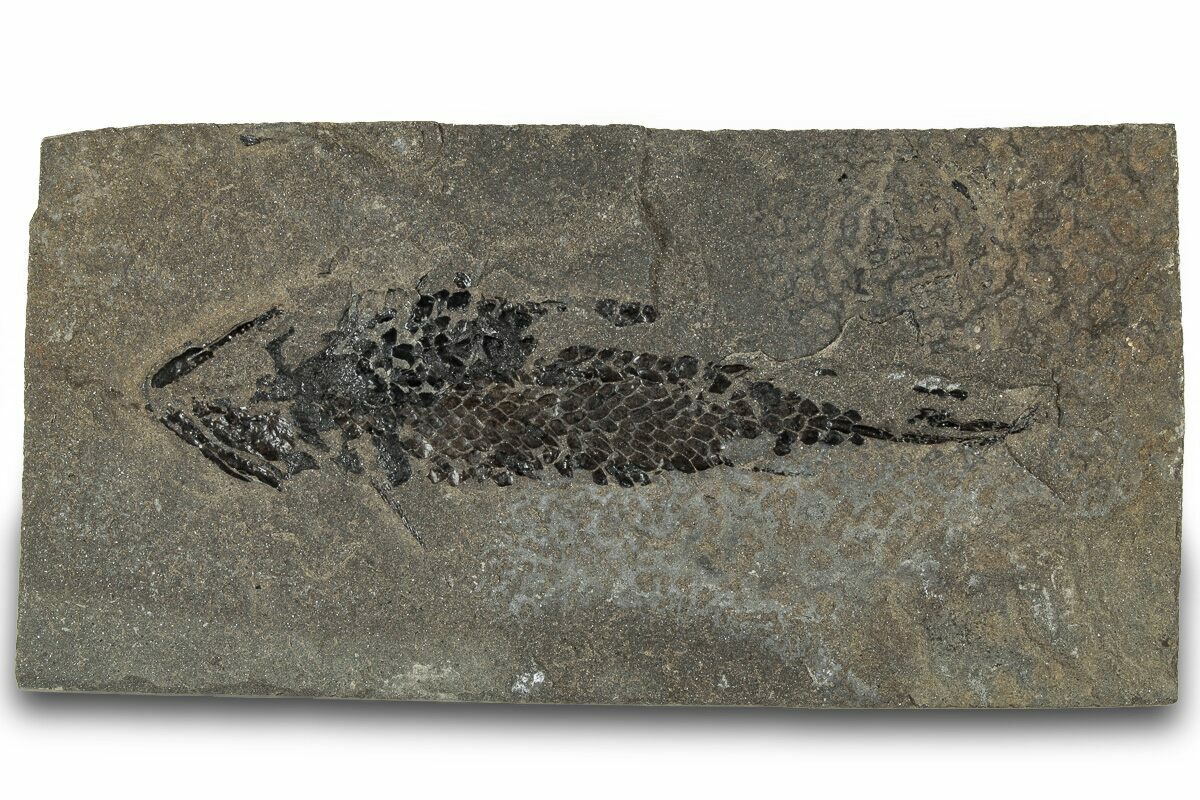 This is a 3.4" long specimen of the Devonian "Lobed-Fin" fish, Osteolepis panderi. It was collected from the Middle Devonian-aged Old Red Sandstone in Caithness, Scotland. It comes with an acrylic display stand.