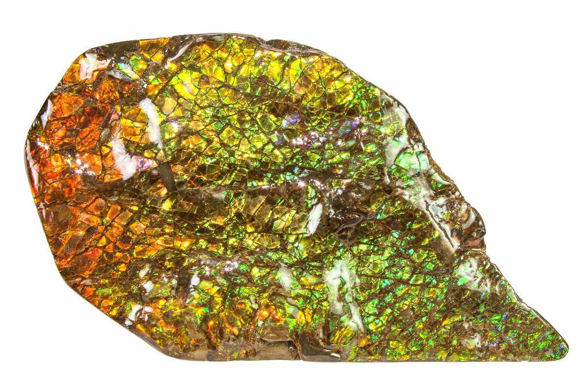 Ammolite is an opal-like gemstone found primarily in Alberta, Canada. It is a kind of fossilized shell from ammonites, which in turn are composed primarily of aragonite, the same mineral contained in nacre (mother-of-pearl). The shell's microstructures are often preserved. In 1981, ammolite was given official gemstone status by the World Jewellery Confederation (CIBJO).