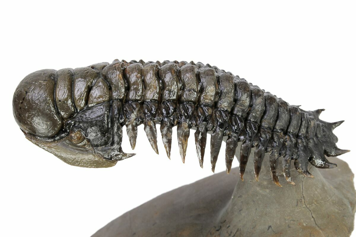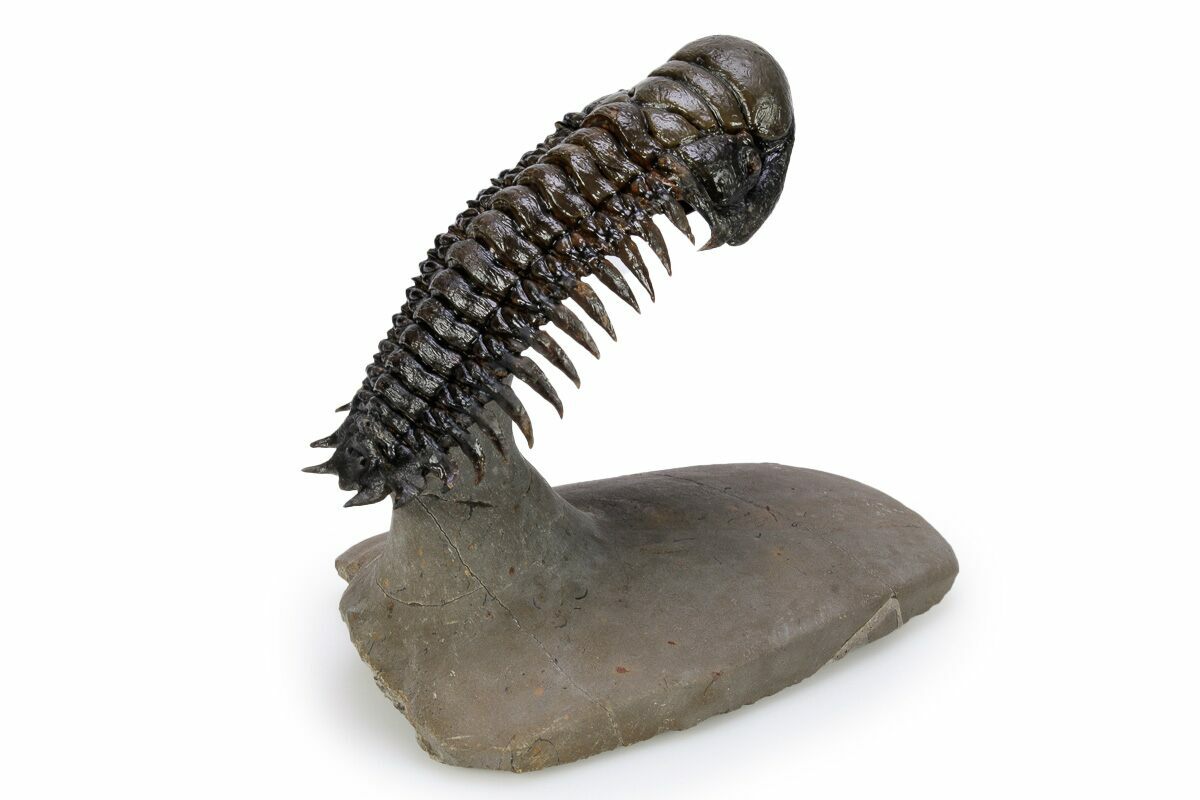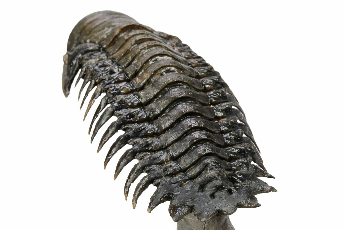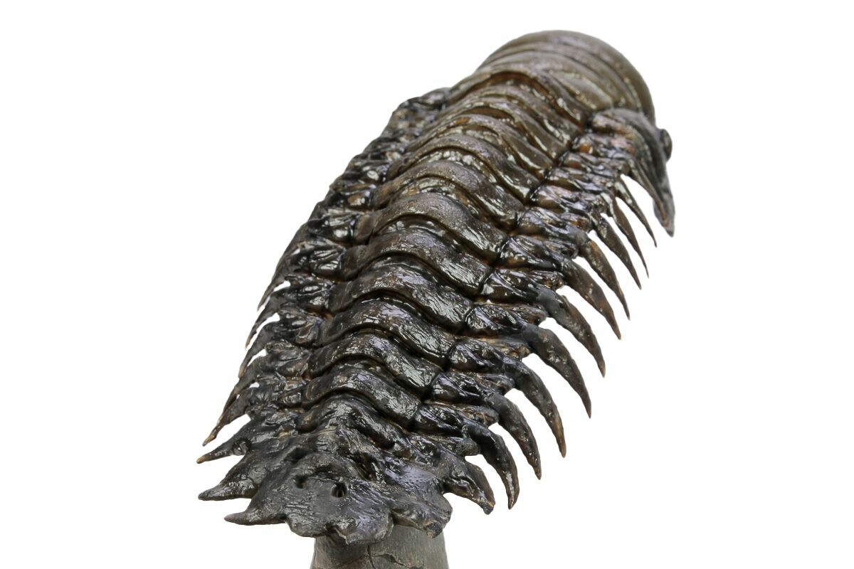 This is an impressive, 3.4" long specimen of Crotalocephalina gibbus from Atchana, Morocco. Nice preparation and shell detail. It has been prepared in a "flying" pose by removing nearly all of the surrounding limestone. This leaves it floating above the rock on a pedestal. The preparation takes lot of time but the results are quite spectacular. It has about 1-2% shell restoration in total.