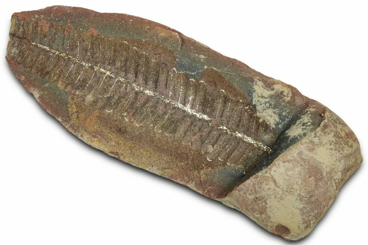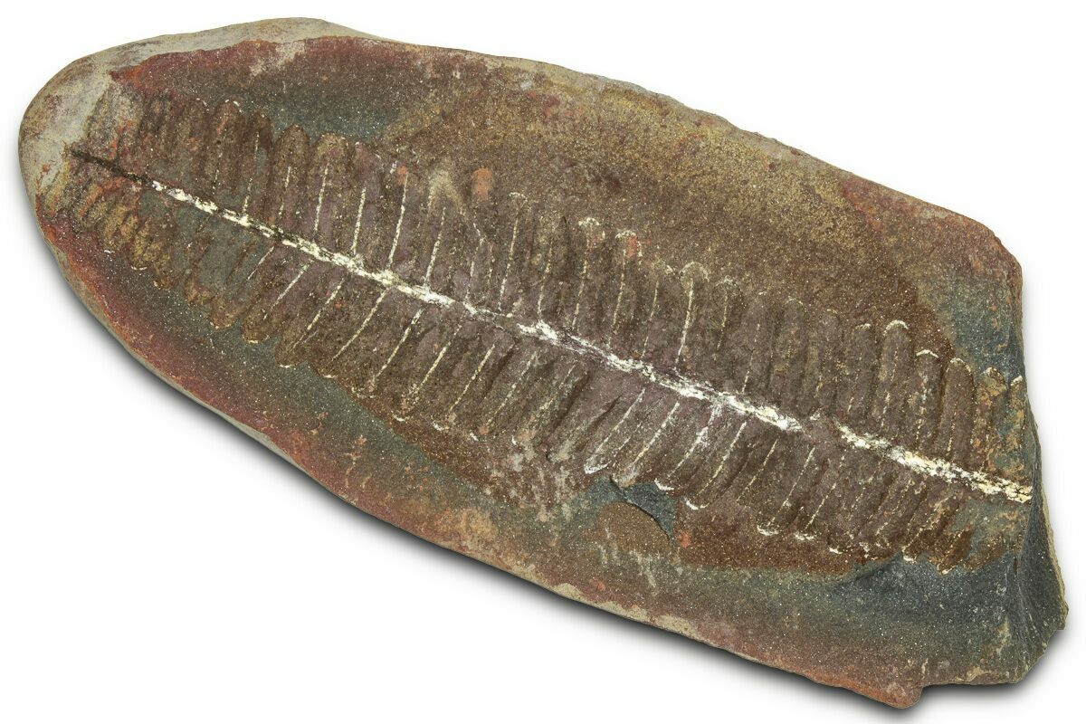 This is a 3.4" fern fossil (Pecopteris sp.) from the Carbondale Formation (Francis Creek Shale) in Braidwood, Illinois. It is preserved inside an ironstone nodule associated with the famous Mazon Creek Lagerstätte. Under magnification the detail of this specimen stands out. Both the positive (convex) and negative (concave) sides of the fossil nodule are included.