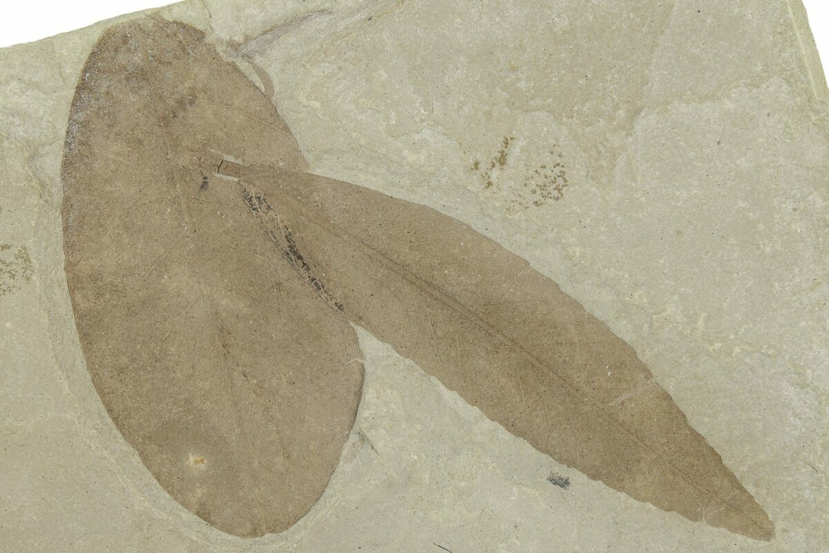 This is a 3.4" wide slab of shale containing two fossil leaves. The longest (2.1" long including stem) is a leaf of the species Cedrelospermum nervosum; a species of plant classified within the Ulmaceae family, which includes modern trees like elm and hackberry. The smaller, oval shaped leaf is of the species Leguminosites lesquereuxiana, a type of legume. This specimen was collected from the Green River Formation in Utah.