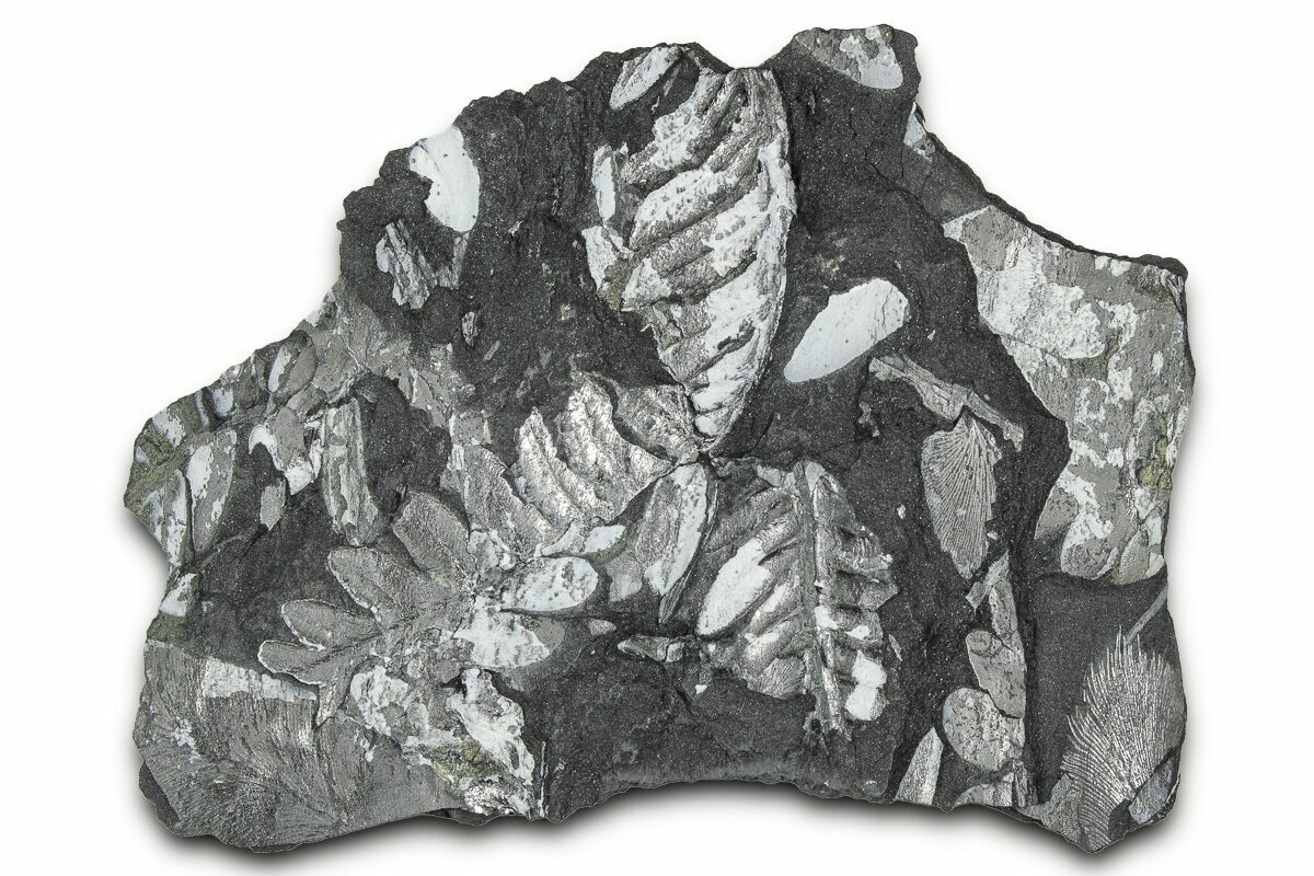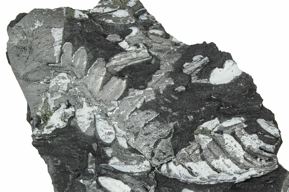 These plants were buried in a swamp where a low temperature, low pressure, and low oxygen environment caused the plant tissue to be slowly replaced by pyrite. This pyrite was later replaced by a whitish mineral (aluminum silicate) as the fossils were buried and exposed to the heat and pressure inside of the earth. The majority of the ferns on this plate are of the genus Alethopteris, though Pecopteris ferns can be seen from time to time.