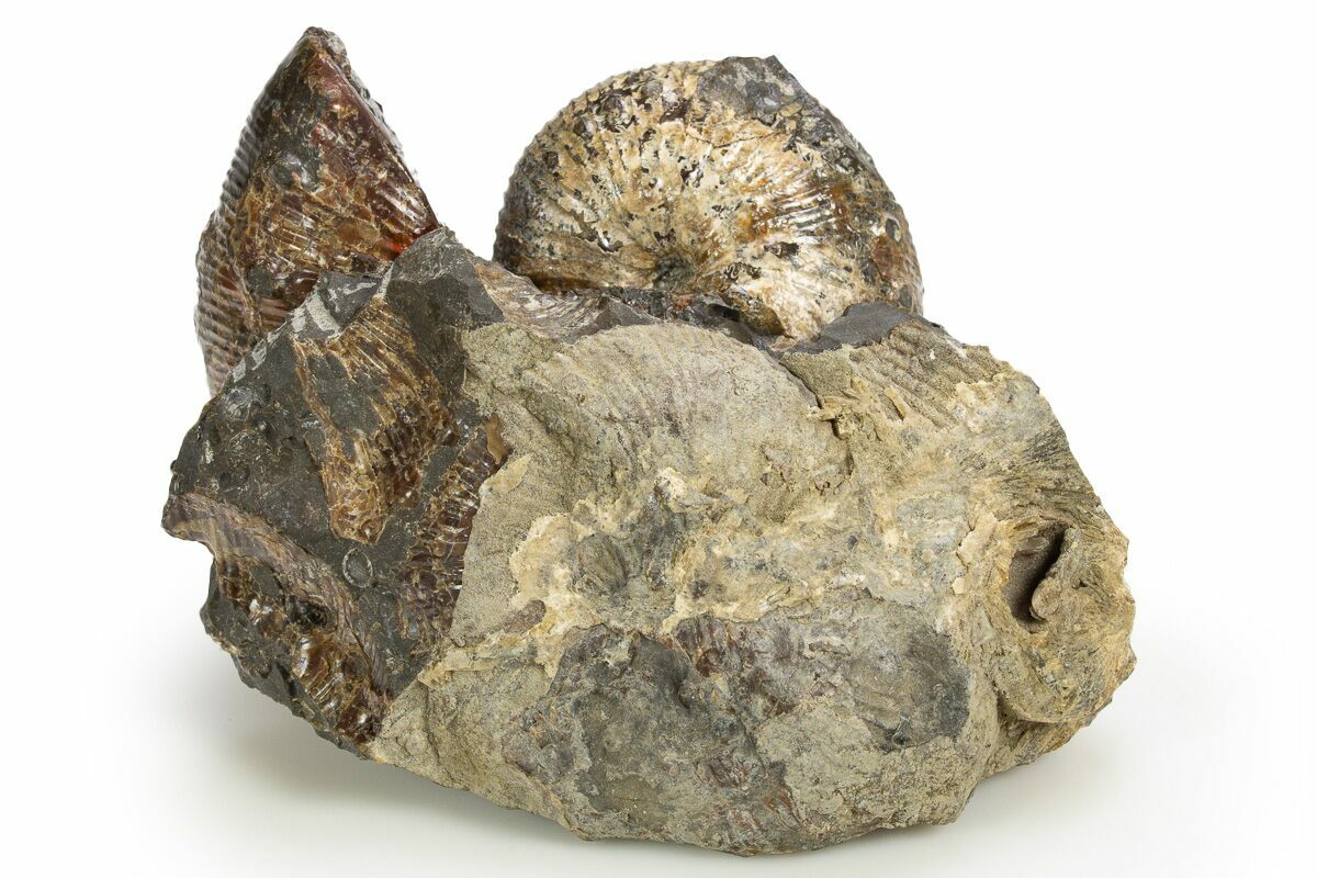 After death, these ammonites settled into seafloor sediments where mineral-rich waters slowly formed concretions around the shells, protecting them from crushing and decay for tens of millions of years. When these stone nodules are split open today, the fossils are revealed locked inside and must be carefully hand-prepared to remove the surrounding rock. This delicate, time-consuming process—often done with air scribes and fine tools—can take many hours per specimen, gradually exposing the shell’s ribs, sutures, and natural curvature. The finished fossils are striking remnants of South Dakota’s ancient ocean, preserving a moment from a world that vanished long before dinosaurs walked on land.