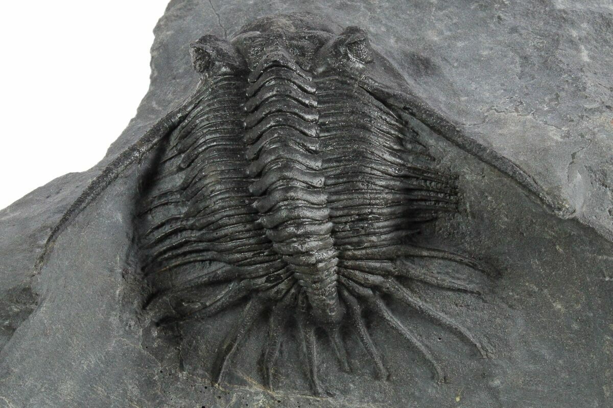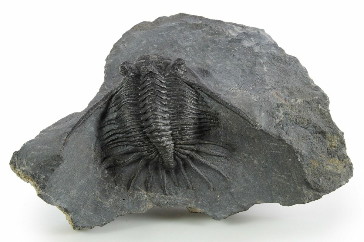 This is a scarce, 3.4" long Kayserops megaspina trilobite collected at Bou Lachrhal, Morocco. In the past this trilobite has often been referred to as “Comura cometa", but it actually bears few similarities with the genus Comura. This is a nice specimen with only about 3% shell restoration along a repaired crack.
