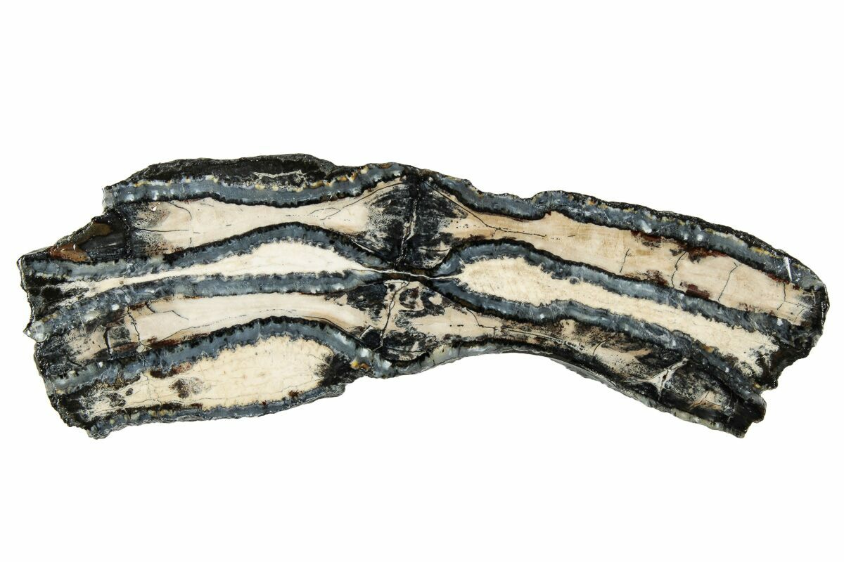 This is a interesting, cross-sectional slice of a Columbia Mammoth (Mammuthus columbi) molar collected from the coastal region of South Carolina. It comes with a riker mount display case.