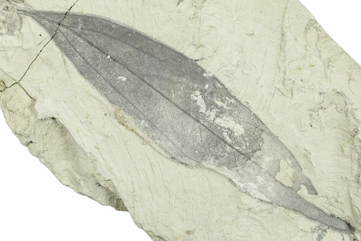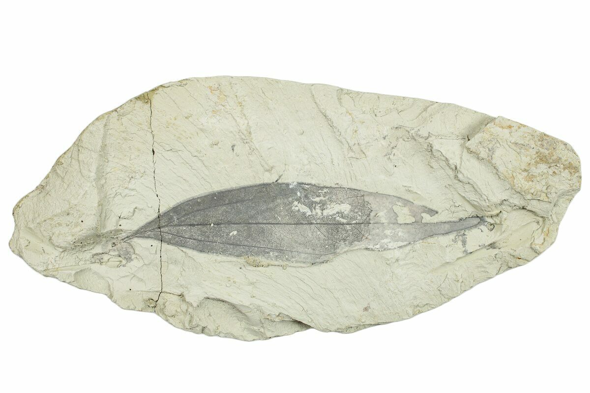 This is a 3.4" long fossil leaf (Daphnogene (Cinnamomum) lanceolatum) collected from Miocene-aged deposits near Augsburg, Germany. This is part of an older collection our team recently acquired. One end of this plate was broken and reattached at some point.