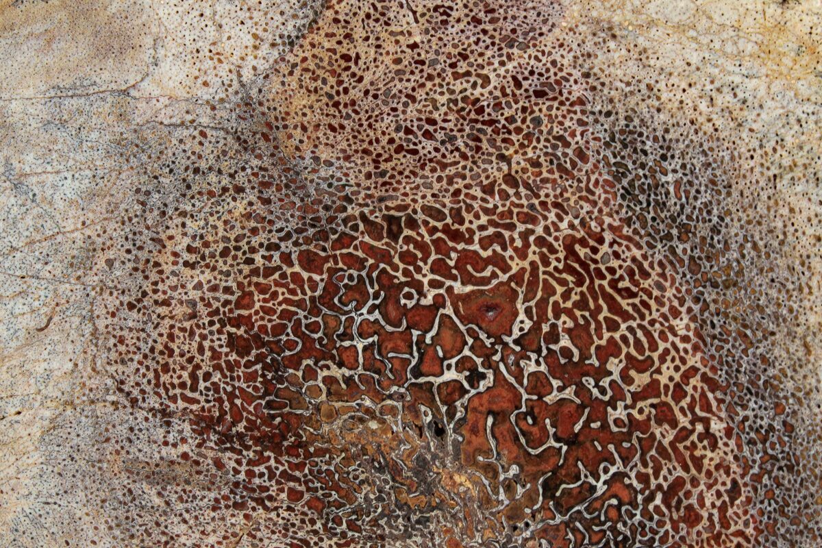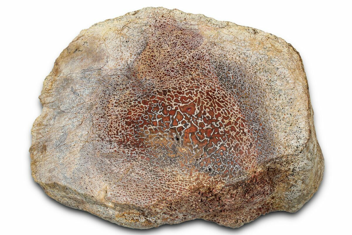 Dinosaur gembone (agatized dinosaur bone) forms when the porous structure of dinosaur bone is replaced by silica-rich minerals like agate, chalcedony, or jasper. This preserves the bone’s internal cell patterns, creating striking, web-like textures visible when polished.