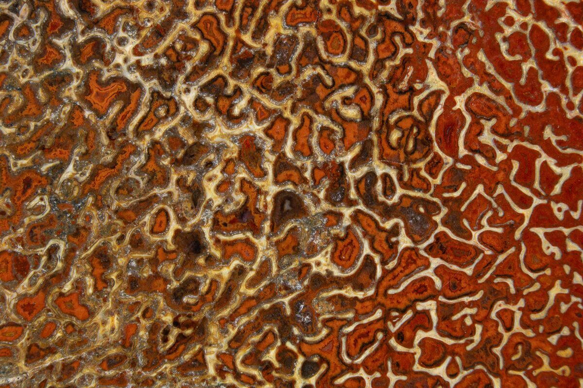 Dinosaur gembone (agatized dinosaur bone) forms when the porous structure of dinosaur bone is replaced by silica-rich minerals like agate, chalcedony, or jasper. This preserves the bone’s internal cell patterns, creating striking, web-like textures visible when polished.