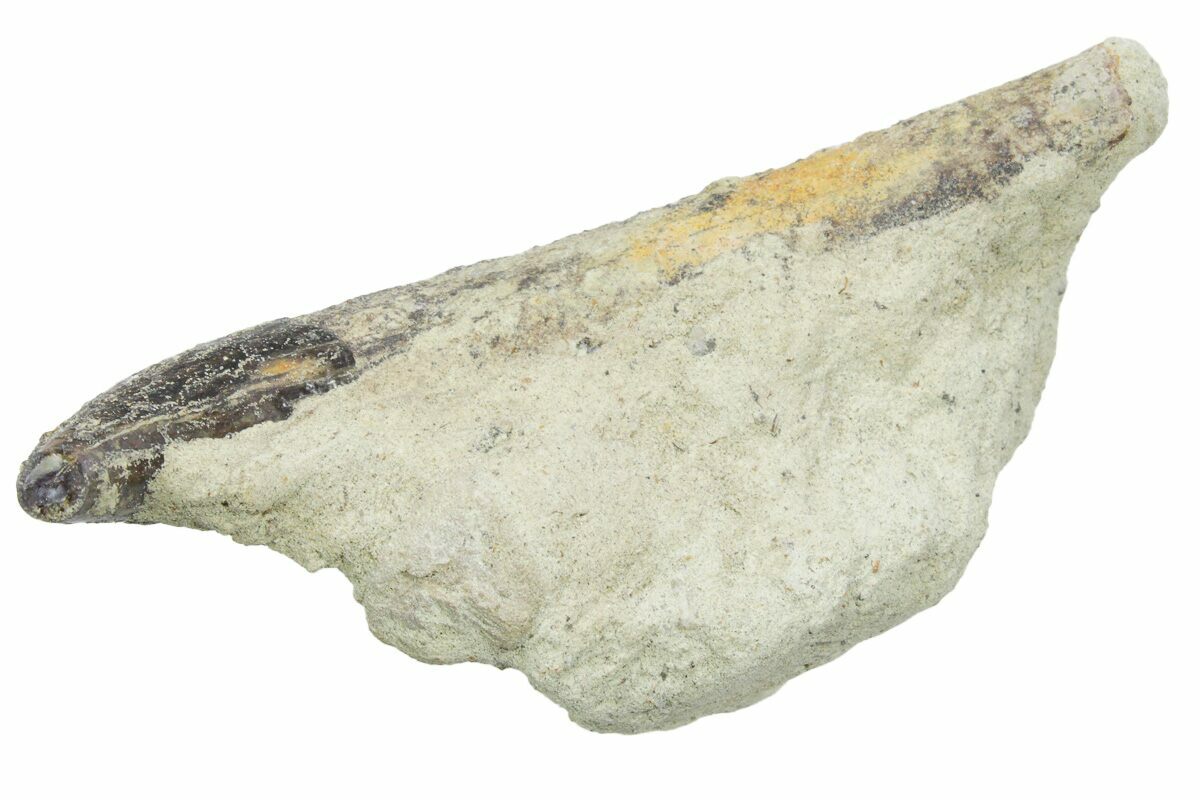 This is a 3.4" long, rooted fossil Sea Lion (Allodesmus kernensis) tooth from Sharktooth Hill near Bakersfield, CA. It is still partially embedded in the sandstone in which it was found.