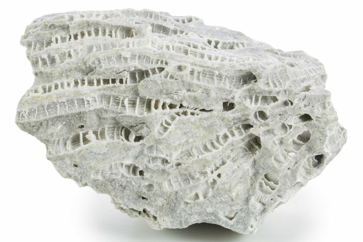 This is an interesting 3.4" wide section of dolostone containing fossil rugose coral of the species Fletcheria guelphensis. It has been left in its rough state to reveal the sparkling interior of the coral's "skeleton". The dolostone was collected from a Middle Silurian-aged deposit within the Greenfield Formation in Clay Center, Ohio.