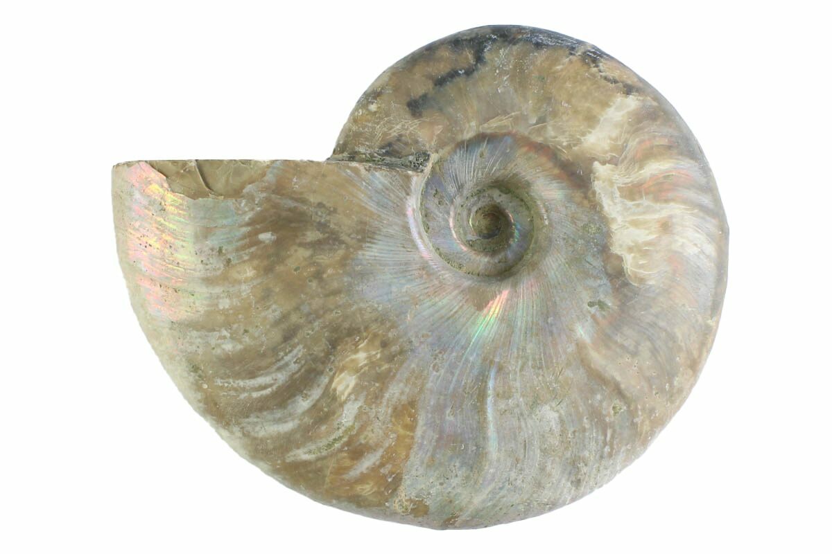 Silver iridescent ammonite fossils from Madagascar are striking cut-and-polished fossils that display a brilliant, metallic silver flash across their coiled chambers, often shifting to subtle blues and greens as the light moves. This shimmering effect is caused by ultra-thin, microscopic layers within parts of the shell or mineral replacement that act like a natural light prism, reflecting and amplifying certain wavelengths through interference. The result is a sleek, chrome-like iridescence that contrasts beautifully with crisp white calcite septa tracing elegant patterns through the spiral, making these specimens exceptional display pieces.