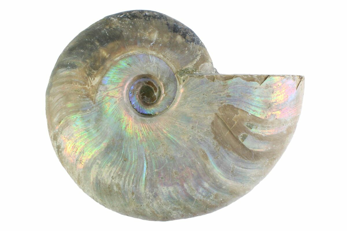 This beautiful, 3.4" wide ammonite fossil was collected near Mahajanga Province, Madagascar, and displays a shimmering silver iridescence. It belongs to the genus Cleoniceras, a marine ammonite that thrived in the region’s shallow Cretaceous seas roughly 110 million years ago. When viewed in the right light—or when the surface is wet—the fossil reveals a vivid, rainbow-like iridescent flash that highlights the natural beauty of its preserved shell.