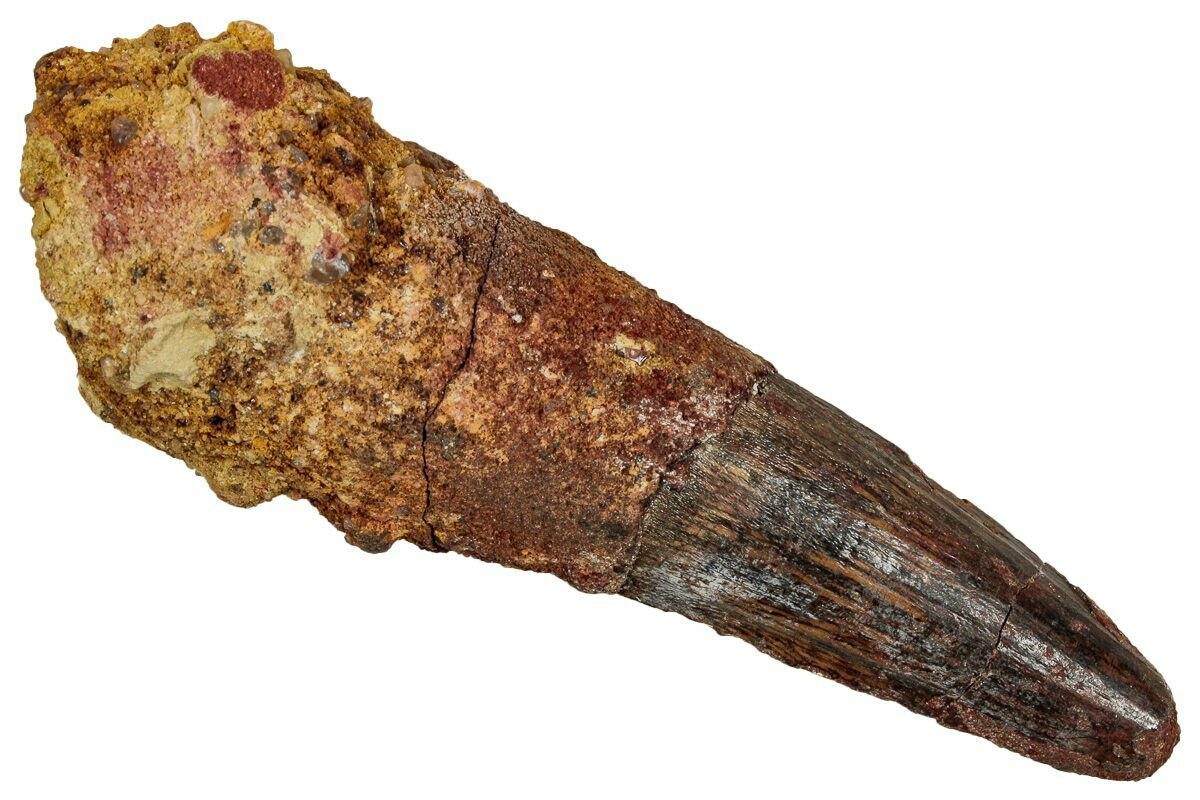 This is a 3.40" long Spinosaurus tooth from the Kem Kem Beds of Morocco. It is Late Cretaceous in age, approximately 95 million years old.
