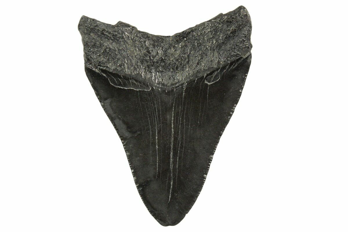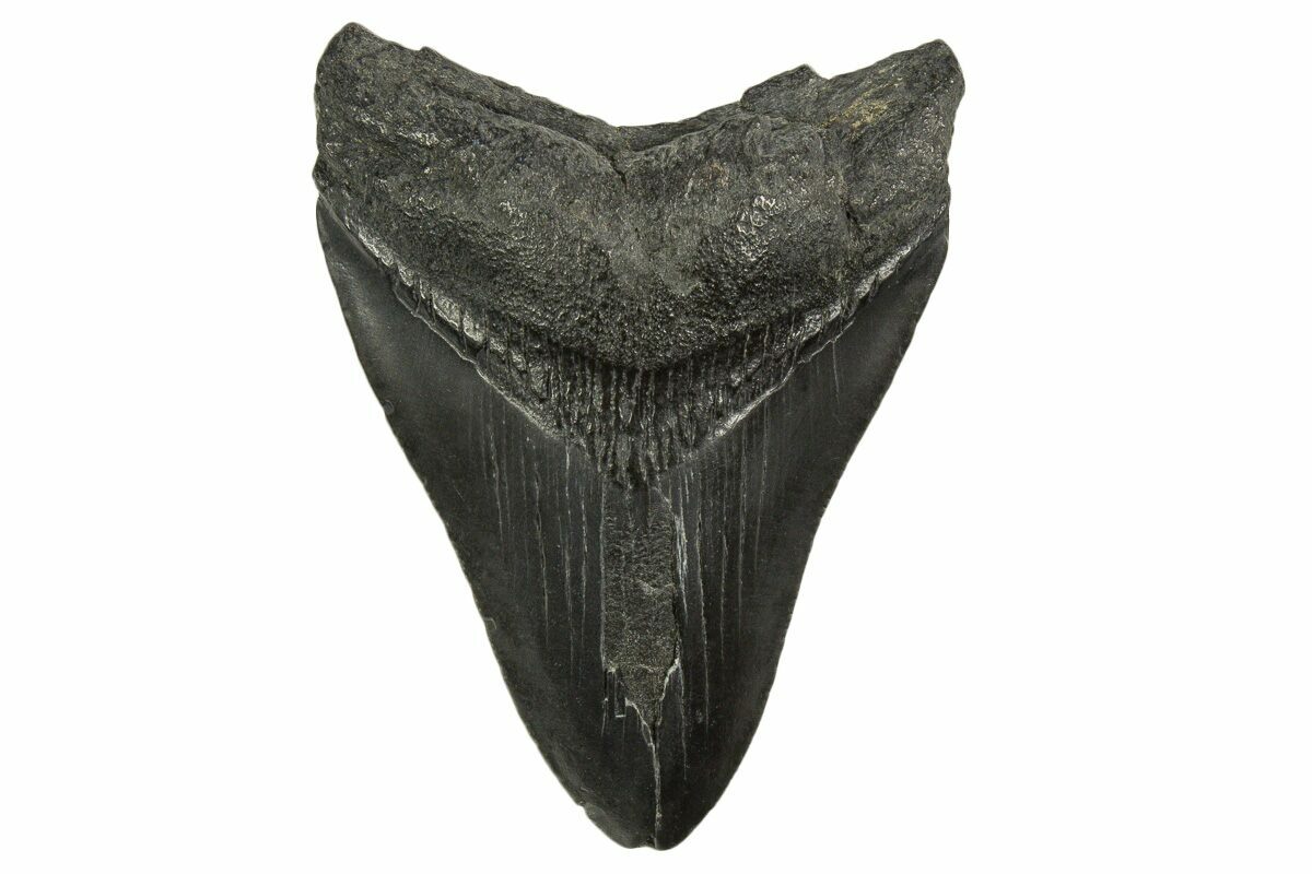 This is a 3.41" long fossil megalodon tooth collected from a river in South Carolina. The tooth would have come from a prehistoric mega-shark in the 30 foot size range.