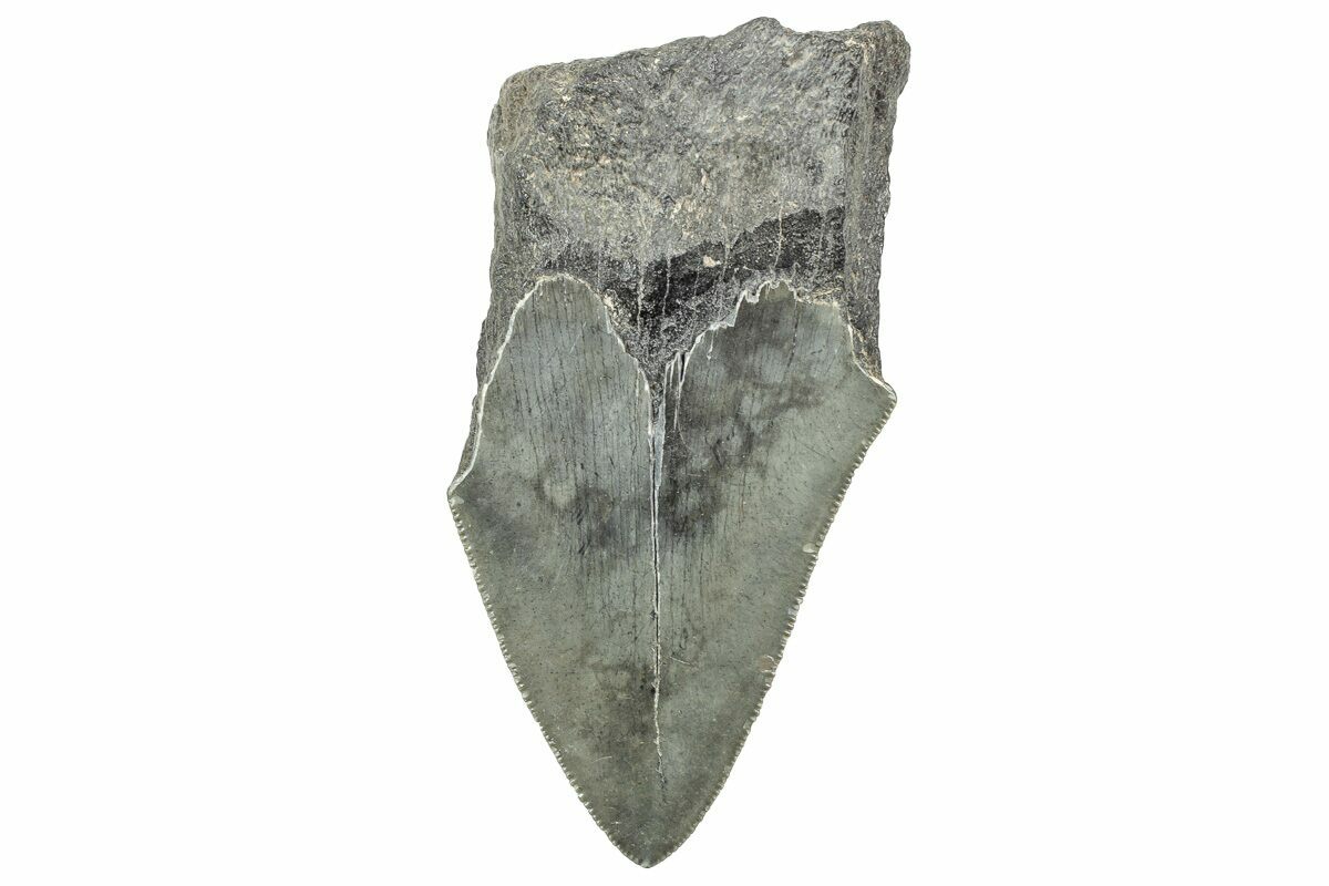 The standard measure for megalodon teeth is slant height, or the longest edge of the tooth. Adult megalodon teeth were typically in the 4 to 5 inch range: teeth over 6 inches are rare and represent super-sized individuals. Only a handful of teeth have ever been found over seven inches.