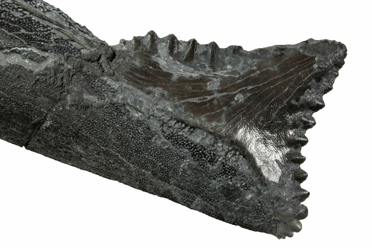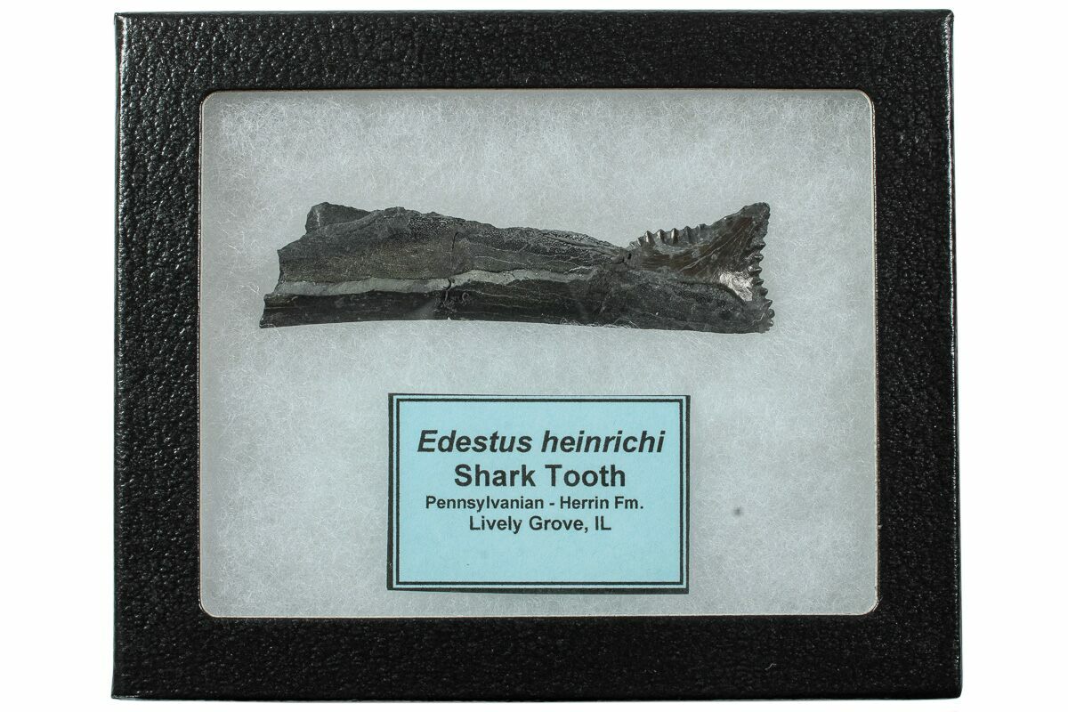 This is a very unusual and hard to acquire offering of a fossil tooth and jaw section from the Carboniferous aged shark Edestus heinrichi. These rare teeth are recovered deep underground in the coal mines of Illinois. The tooth is great condition with glossy black-grey enamel preservation. Most of these teeth are found broken or worn.