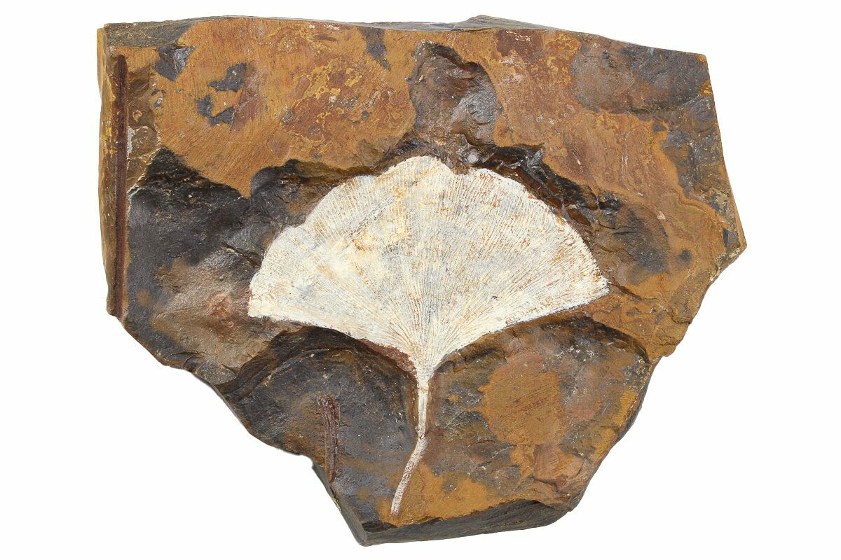 This is a beautiful fossil ginkgo leaf (Ginkgo cranei) from the Sentinel Butte Formation of North Dakota. It is finely detailed and the light preservation contrasts well against the dark orangish-brown rock.