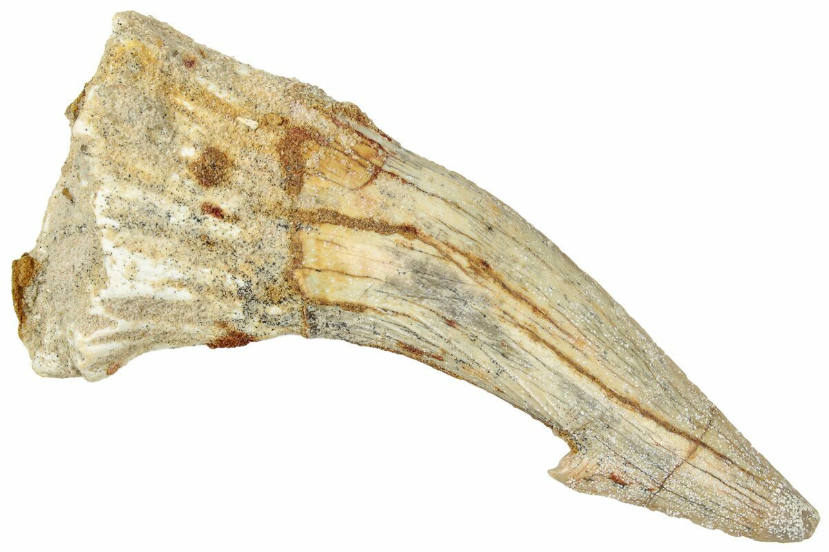 This is a large, 3.45" long rostral barb/tooth from an extinct, giant sawfish (Onchopristis numidus). It was collected from the Kem Kem Beds in Taouz, Morocco.