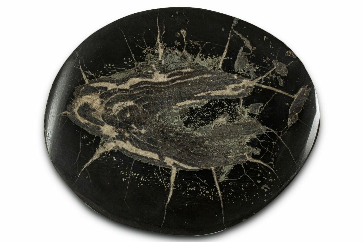 This is a rather unusual fossil, it is a coprolite (fossilized poop) from a large fish. These coprolites are Carboniferous (350 million years old) and are preserved within pyritized nodules. It possibly came from the prehistoric lobe-finned fish, Megalichthys, however identifying fossilized poop down to the species level is nearly impossible, therefore we have left the species as unidentified. The coprolite has been cut in half and highly polished. Some of these specimens have been known to show signs of the fishes meal such as fossilized scales when examined closely.