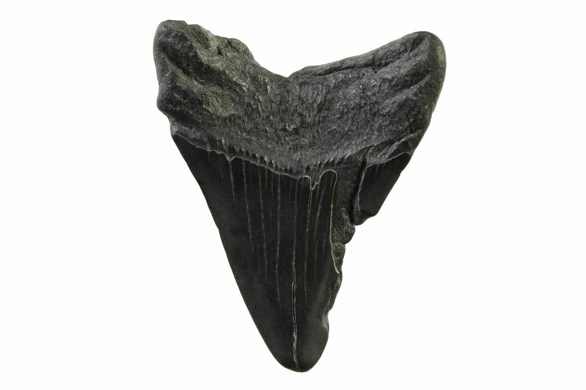 This is a 3.47" long fossil megalodon tooth collected in South Carolina. A tooth of this size would have come from a prehistoric mega-shark in the 35+ foot size range.