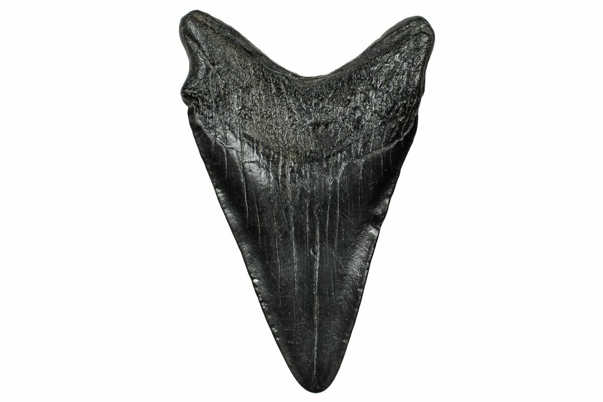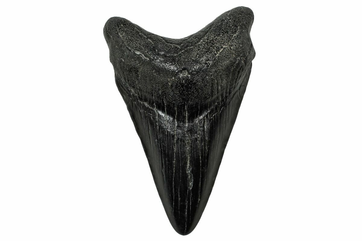 The standard measure for megalodon teeth is slant height, or the longest edge of the tooth. Adult megalodon teeth were typically in the 4 to 5 inch range: teeth over 6 inches are rare and represent super-sized individuals. Only a handful of teeth have ever been found over seven inches.