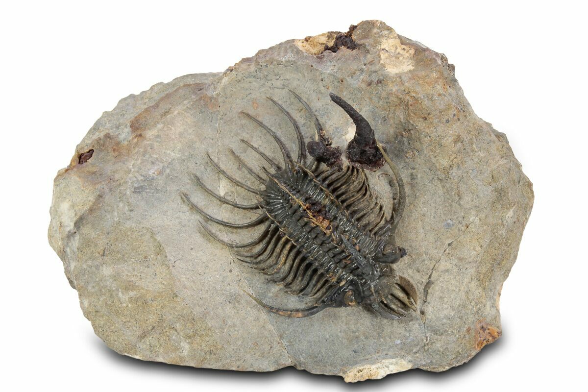 This is a spectacular specimen of one of my favorite species of trilobites, the very alien looking Quadrops flexuosa. This bizarre trilobite has a distinctive four-forked protrusion coming off of the front of it's head which is where the genus gets it's name. It is not only a rare trilobite but extremely hard and time consuming to prepare owing to the hardness of the rock and the its many free standing spines.