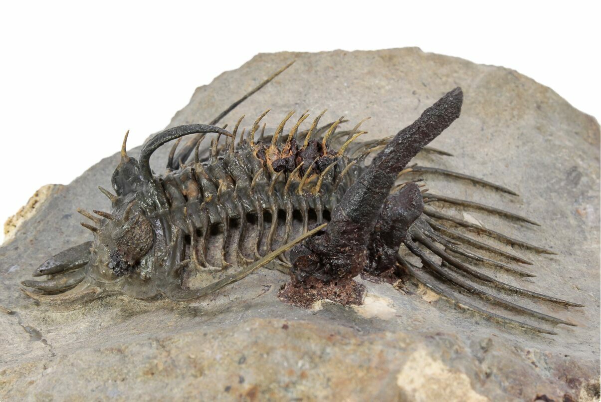 This particular specimen had been in my personal collection for the past couple of years. It measures 3.5" long and has a natural, multi-toned shell coloration. The only restoration is the tips of three small spines, A true top quality example of this fascinating trilobite species.
