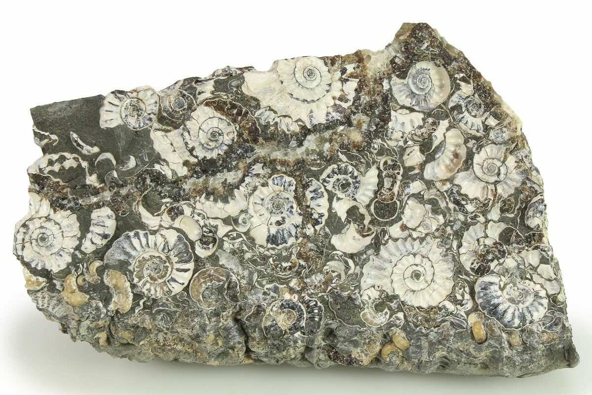 The site that produces this material is no longer accessible. Because of this, these specimens are becoming increasingly harder to obtain. The piece has been painstakingly prepared with mechanical tools to expose all of the individual ammonite fossils.
