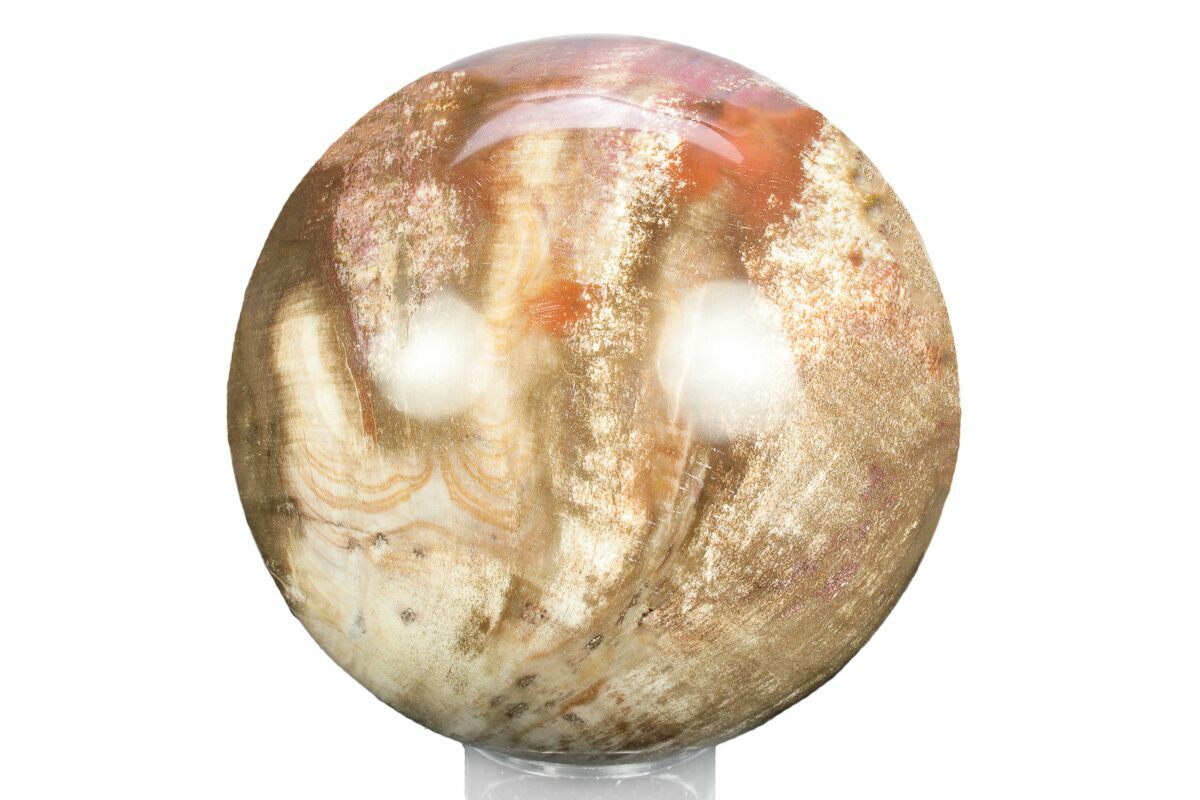 This is a colorful, 3.5" wide, polished sphere of petrified wood from Ambilobe, Madagascar. It is from the Araucaria tree, a type of conifer. The petrified wood is from the early Triassic period, approximately 220 million years old, close to the time the first dinosaurs appeared on the planet.